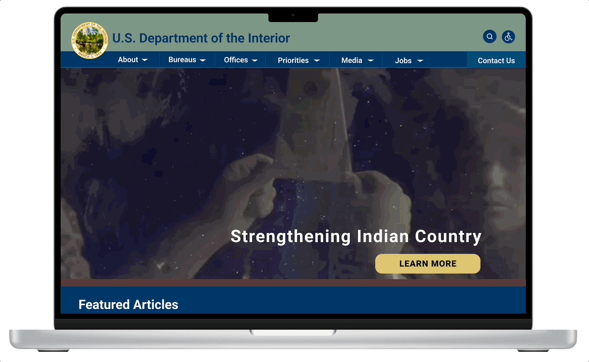 The new Department of Interior homepage has simplified navigation and highlighted information easily accessible.